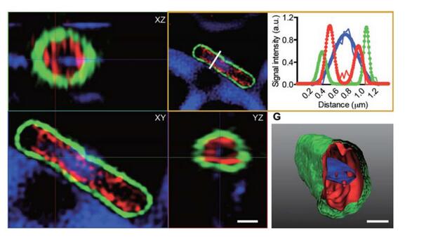 亮点:直径2-3um的沙门氏菌,通过蔡司共聚焦配备的超高分辨率设备Airyscan(点击查看),有效实现2倍分辨率提升,清晰定位GBPs在细菌表面的结合(成像效果类似膜结构)并提高。